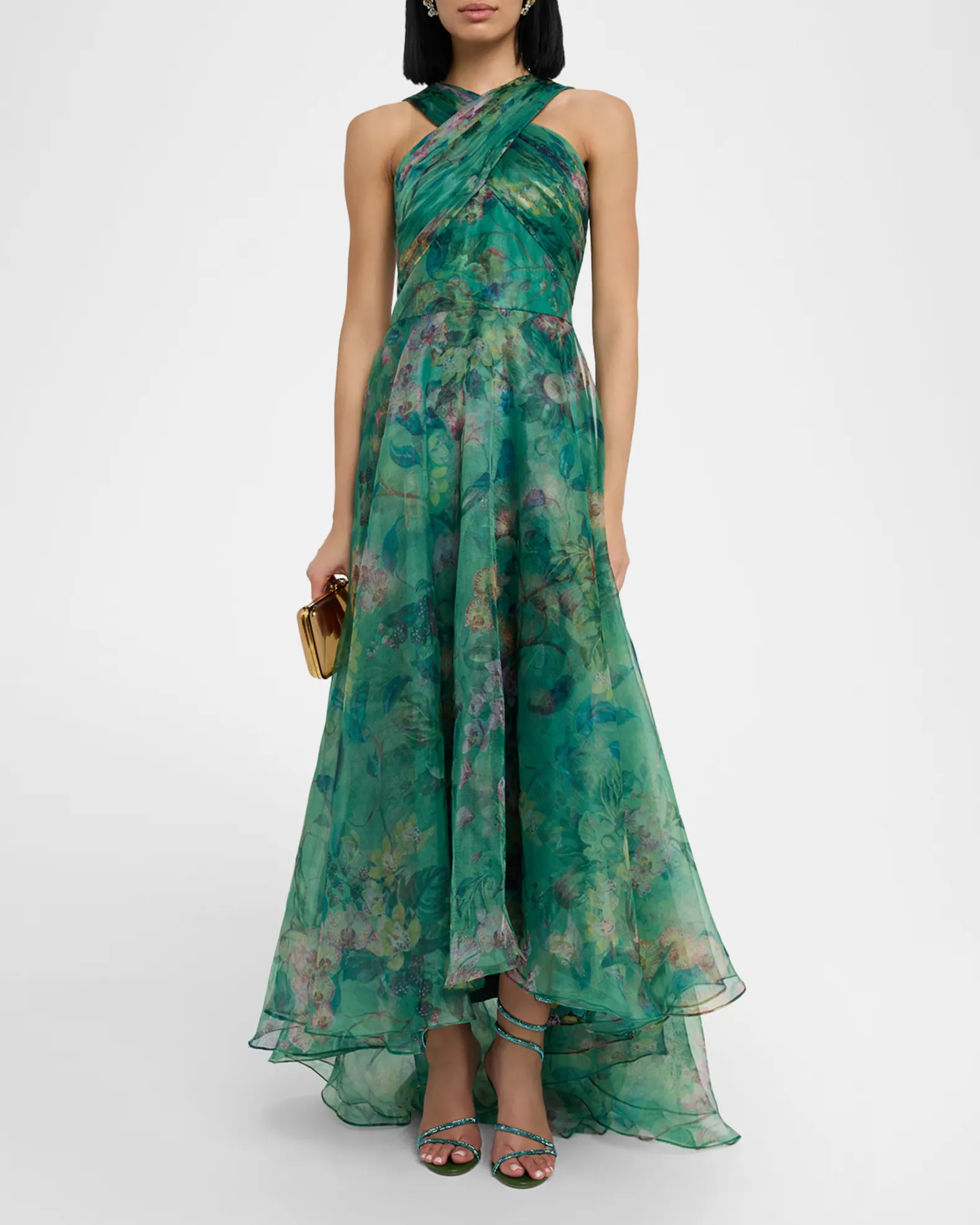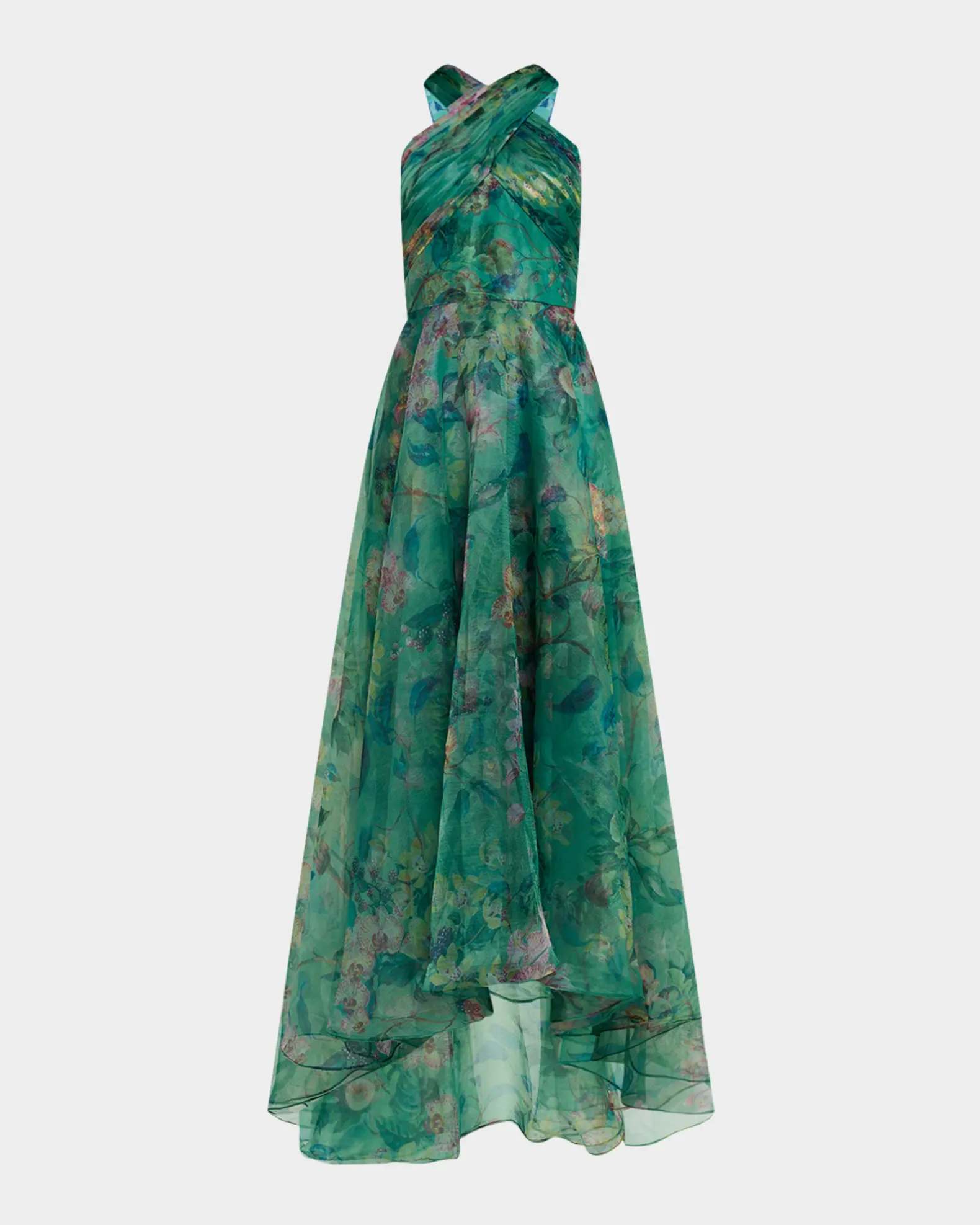 Un vestido que captura la esencia de la feminidad moderna. El organdí ligero crea un volumen etéreo que flota con cada movimiento, mientras el estampado floral aporta un aire romántico y sofisticado. El escote halter realza los hombros y estiliza la figura, creando un equilibrio perfecto entre delicadeza y presencia. Una pieza diseñada para bodas, galas y momentos en los que quieres destacar con elegancia natural.